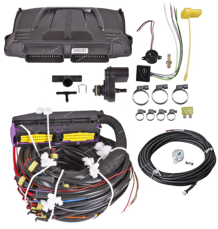 - Полный жгут проводов с коннекторами для подключения 8 газовых инжекторов, датчиков, электромагнитного клапана редуктора, питания и диагностики.